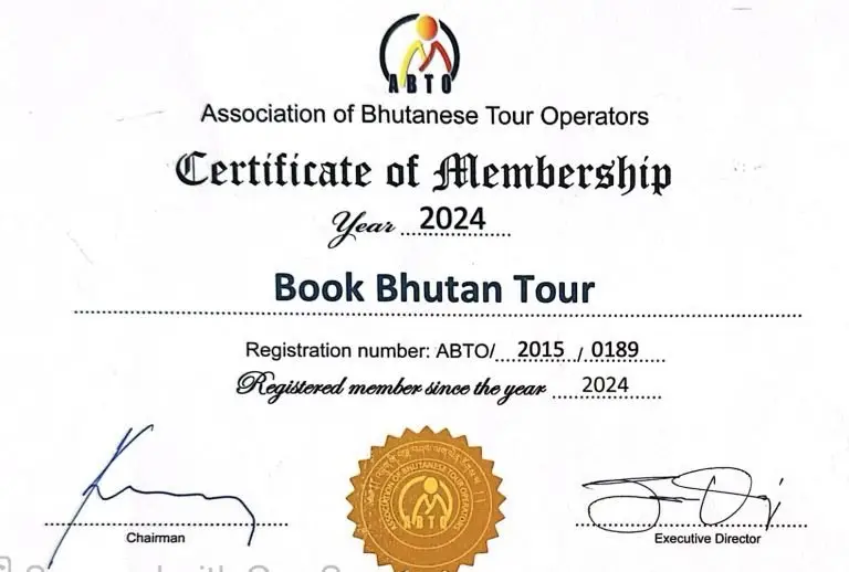 Book Bhutan Tour is licensed under No: 1033320 and ISC Code: (ISIC-63040) by the Department of Tourism Bhutan, the governmental regulatory body for tourism. You can verify our credentials on the official website: https://services.bhutan.travel/search/tour-operator/book-bhutan-tour. Additionally, we are proud to be an active member of the Association of Bhutanese Tour Operators (ABTO), and our membership details can be found at https://abto.org.bt/user-details/16